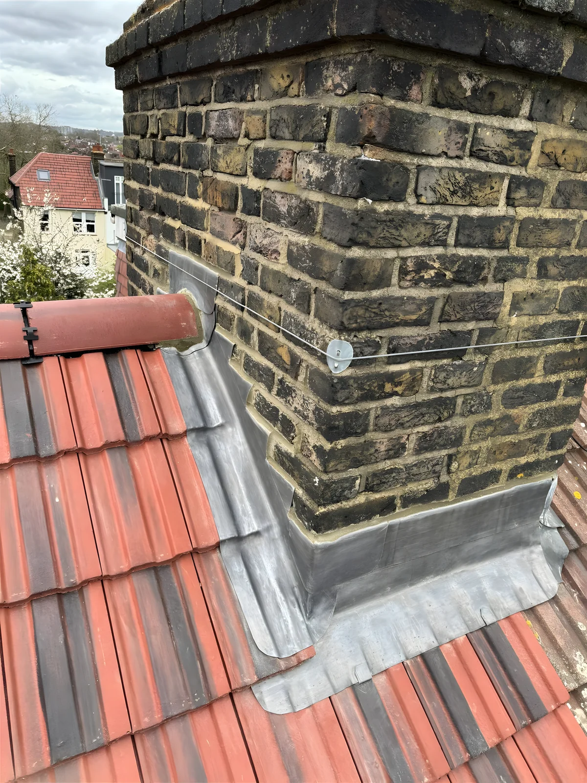 Lead flashing at the junction between a chimney and the roof covering is a critical weatherproofing detail. Cracked or failed lead flashing is responsible for a significant proportion of roof leaks in Surrey. We form and fit Code 4 and Code 5 lead flashings to BS EN 12588 standards.