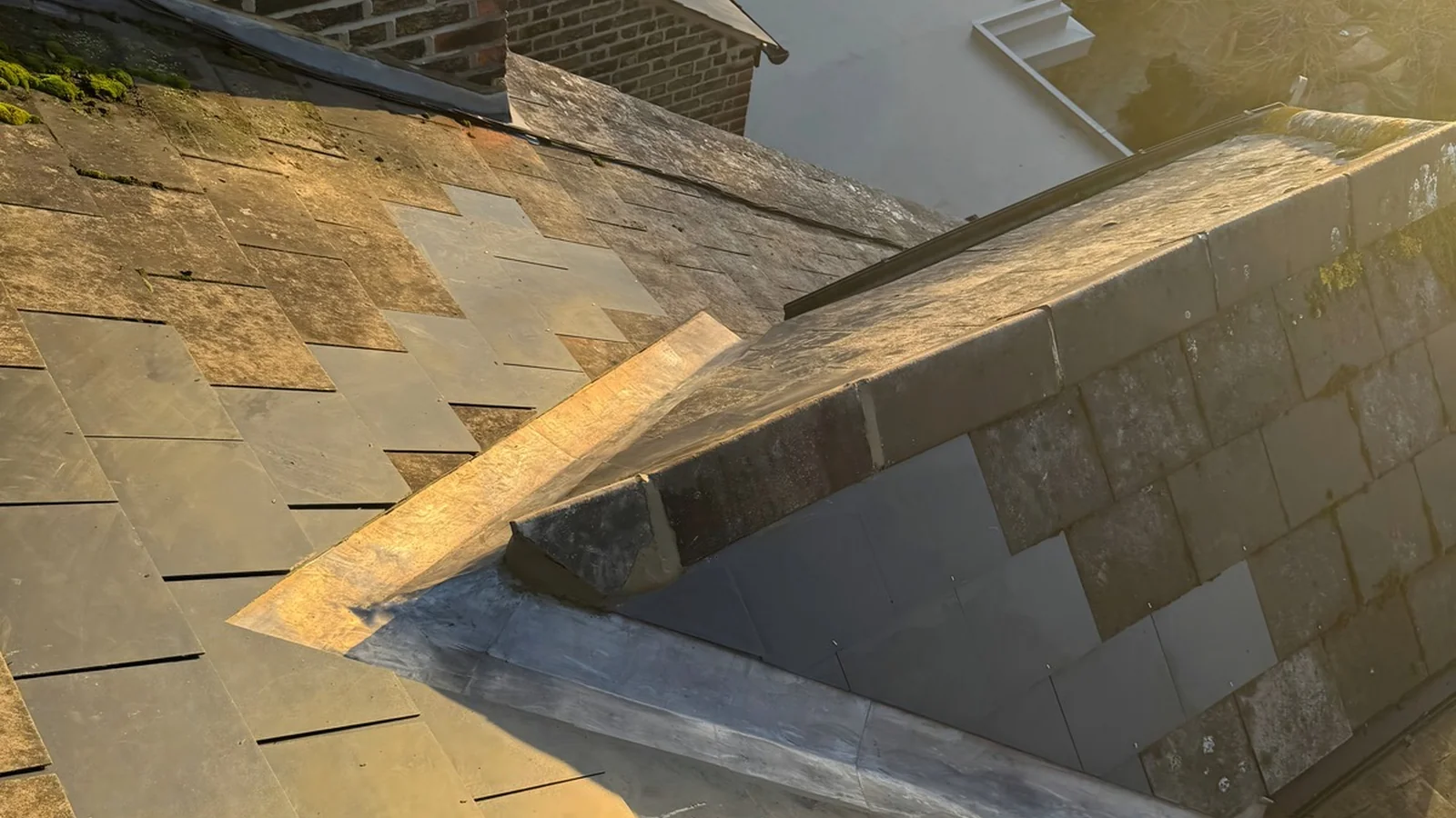 Repair work around a vulnerable roof junction using fresh lead detailing to stop water ingress and improve long-term weather protection.
